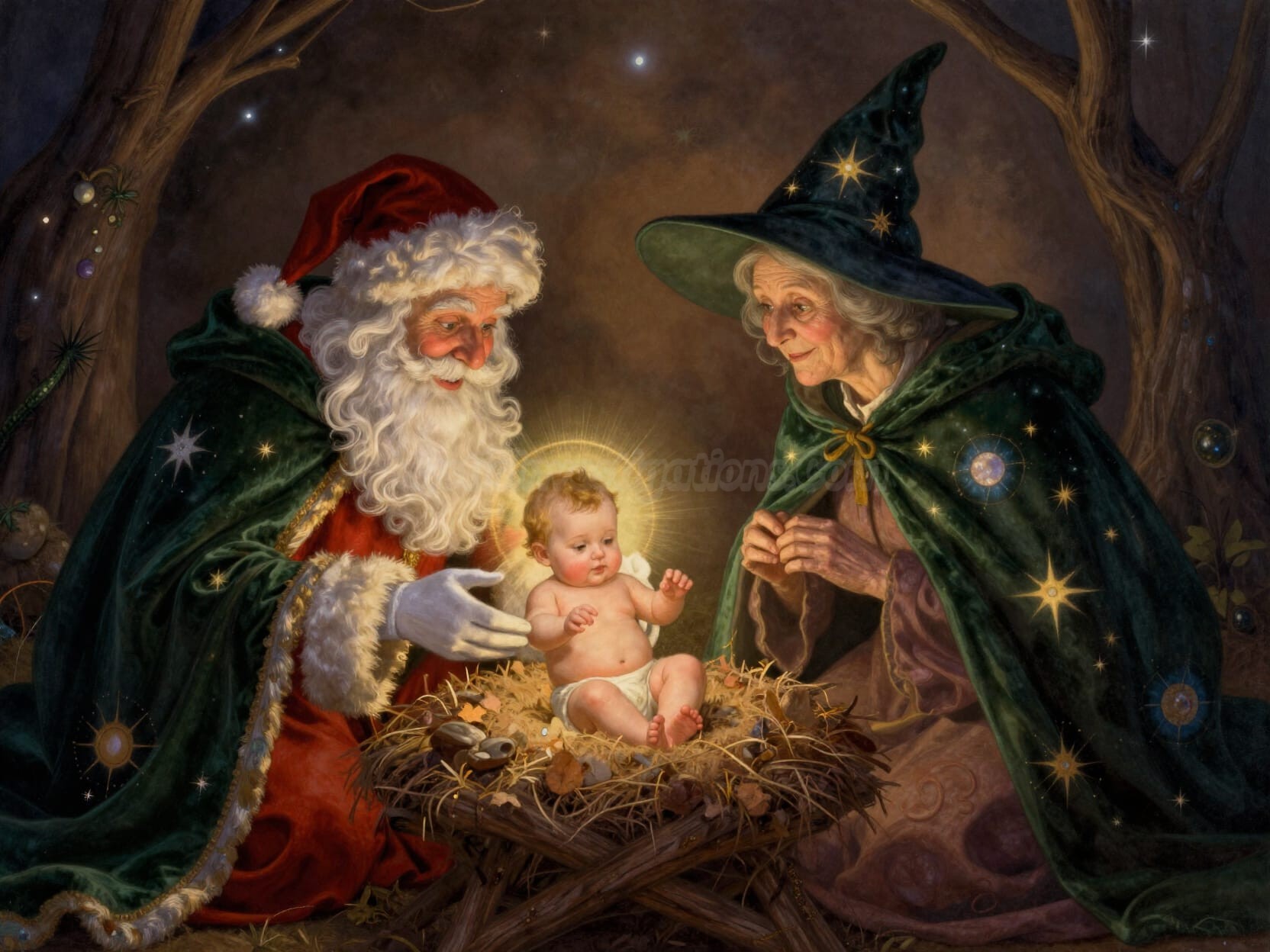 Eventually, she met another immortal traveler: Saint Nicholas, known to the modern world as Santa Claus. They recognized each other instantly as two relics of faith operating on different calendars. They became friends, sharing stories, routes, and burdens. On Epiphany each year, Befana began visiting North Pole City, where the Magi mysteriously appear, unchanged and waiting. There she communes with her fellow supernatural beings and passes out the official gifts of Epiphany along with the Magi.