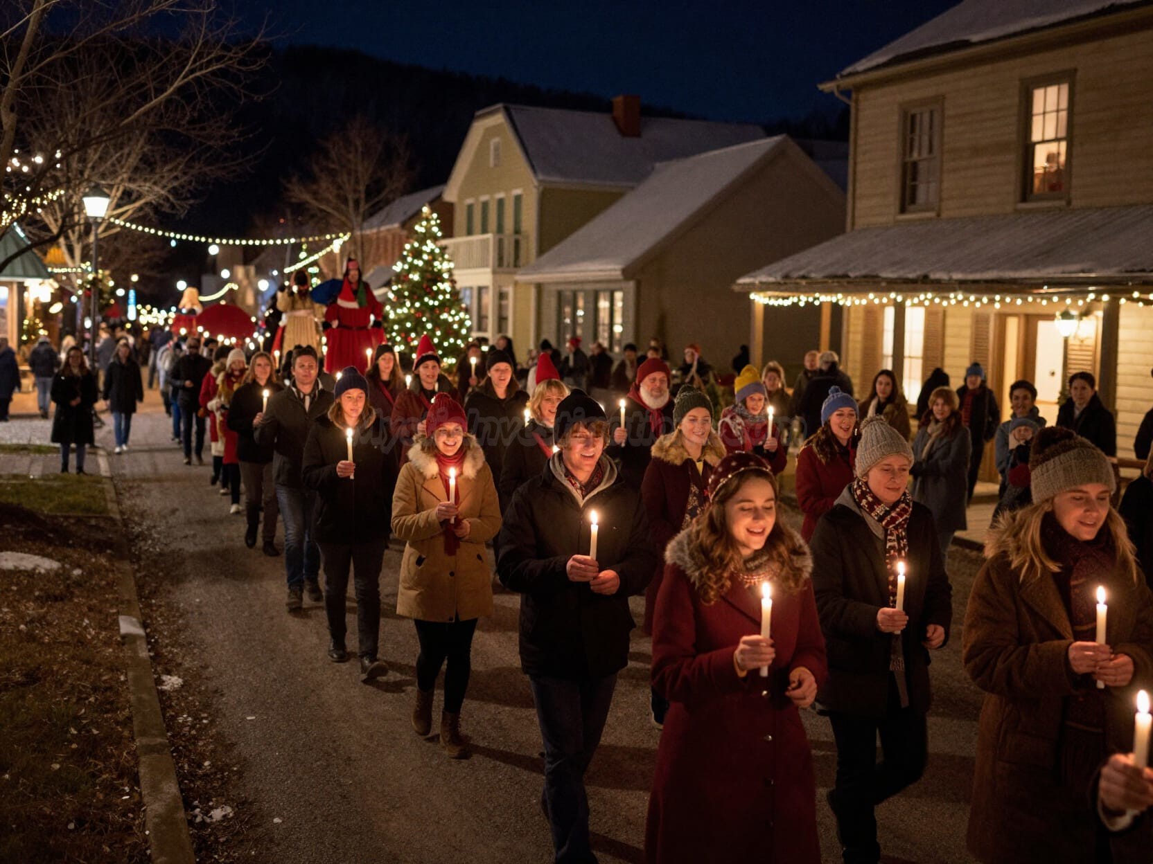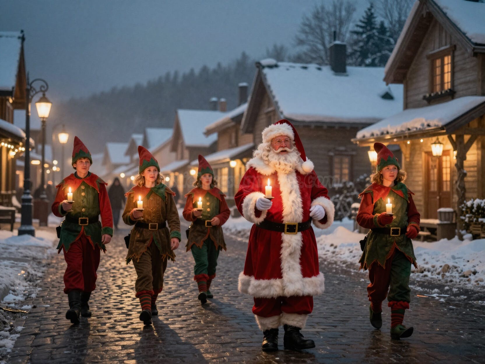 In North Pole City, Candlemas is celebrated with reverence and wonder. Snow-covered cobblestone streets glow with towering candles encased in crystalline ice lanterns, while auroras ripple overhead like celestial flames welcoming the sacred day.