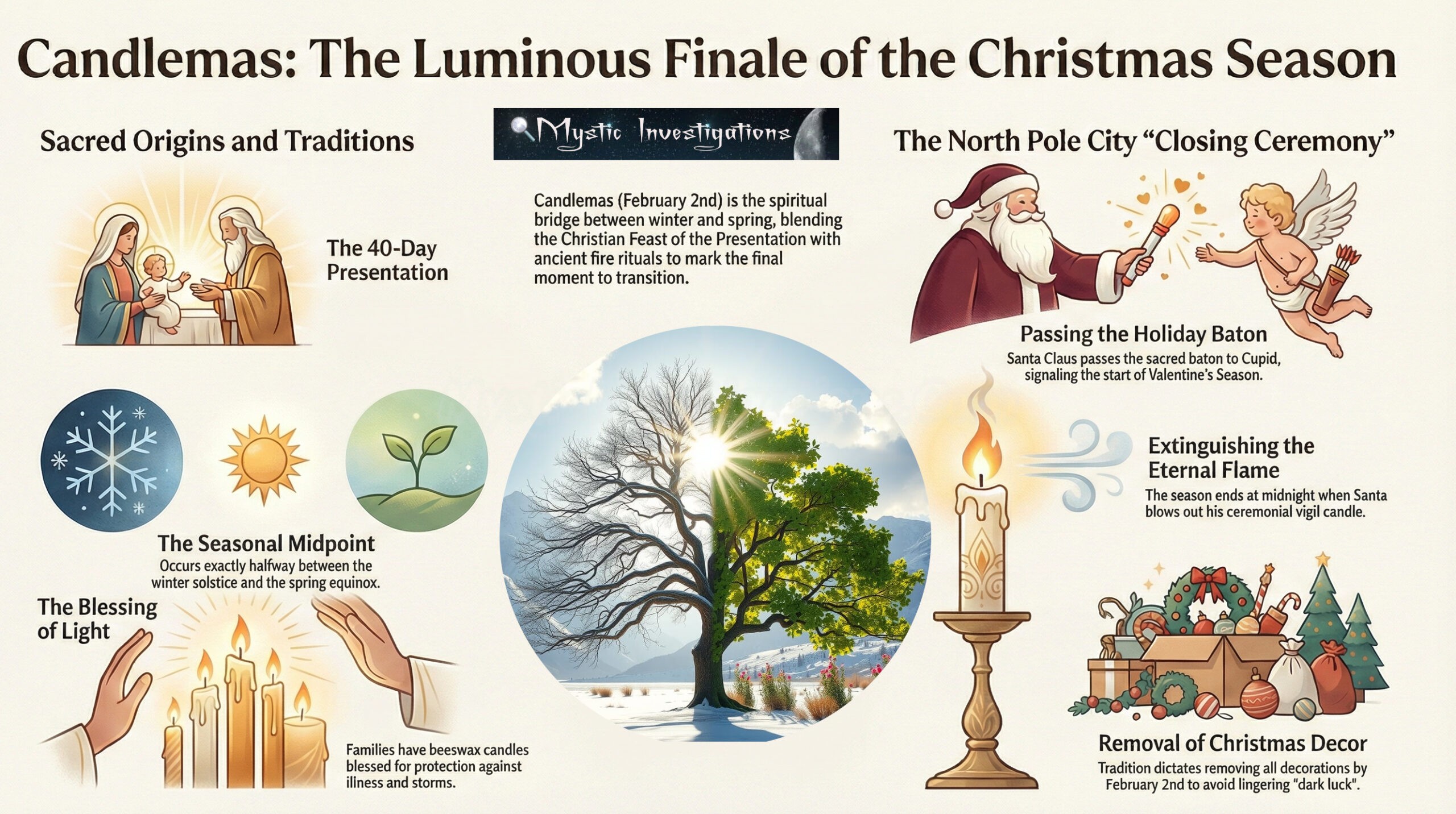 Santa reminded everyone outside of the North Pole to take down their Christmas Decor to avoid the specter of dark luck. Saint Nicholas then blessed the rest of the year before declaring Christmas Closed as he picked up the sacred Holiday Baton. A spiritual conduit that binds all holidays of the light together. He passed it to a Cupid Angel representative of Saint Valentine signifying that only The Valentine Season was in play. The Season began on February 1st thus creating a few days of holiday overlap. During these days some celebrate Valentinmas.
