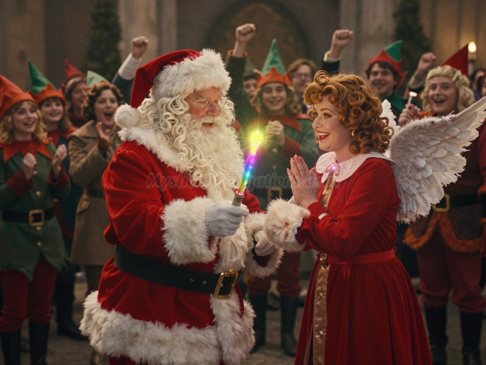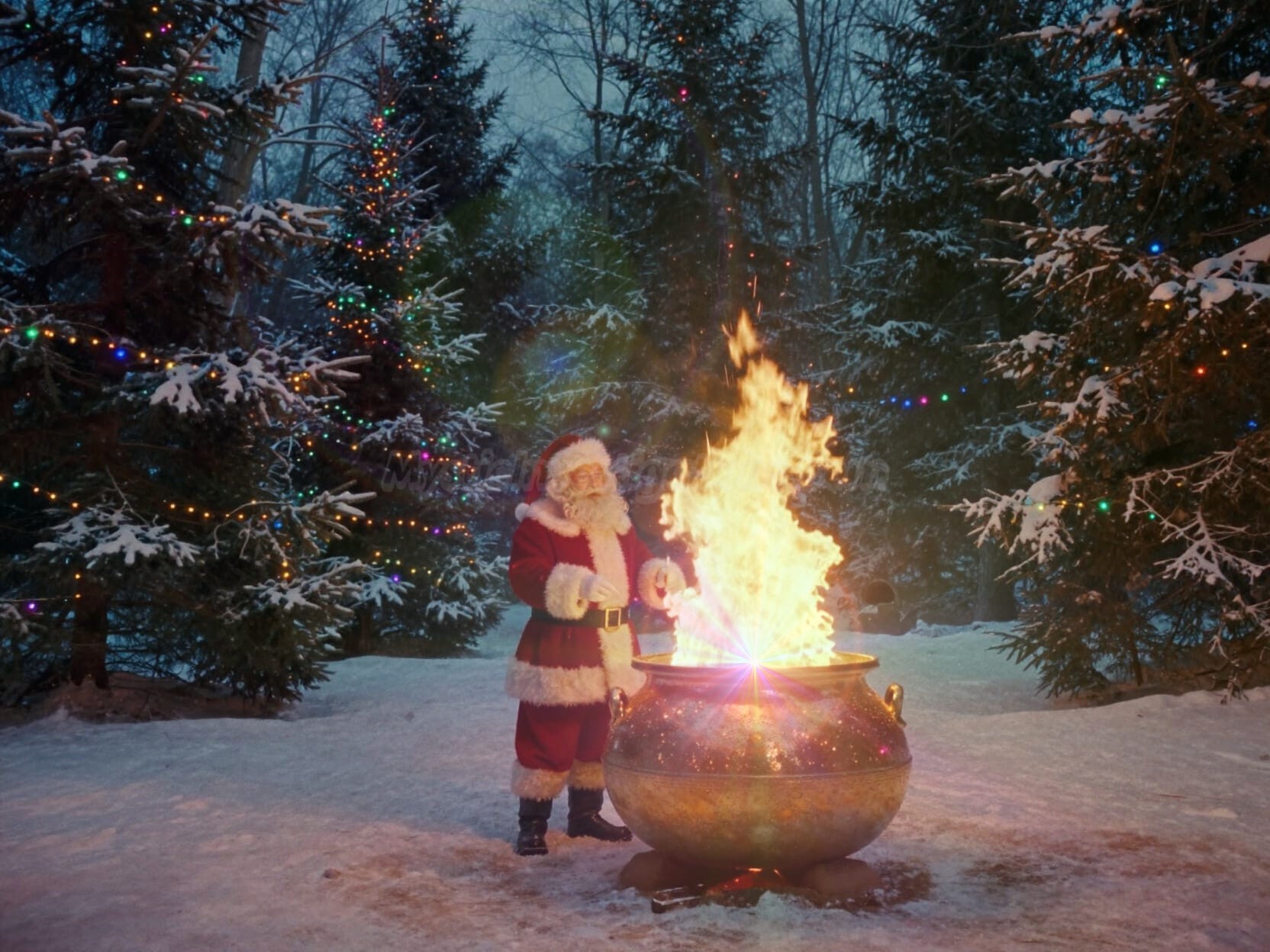 The prolific procession ends in front of The Eternal Flame Of The Christmas Spirit. A sparkling gold cauldron with a metaphysical flame lit from the direct enchanted energy of The Spirit Of Christmas. The flame is so beyond holy that even Frosty The Snowman can stand next to it without fear of melting! Santa Claus along with his wife Holly and children Nick Jr. and Mary stand before the happy crowd. He then addresses the gathered elves, citizens, and guests from the supernatural world.