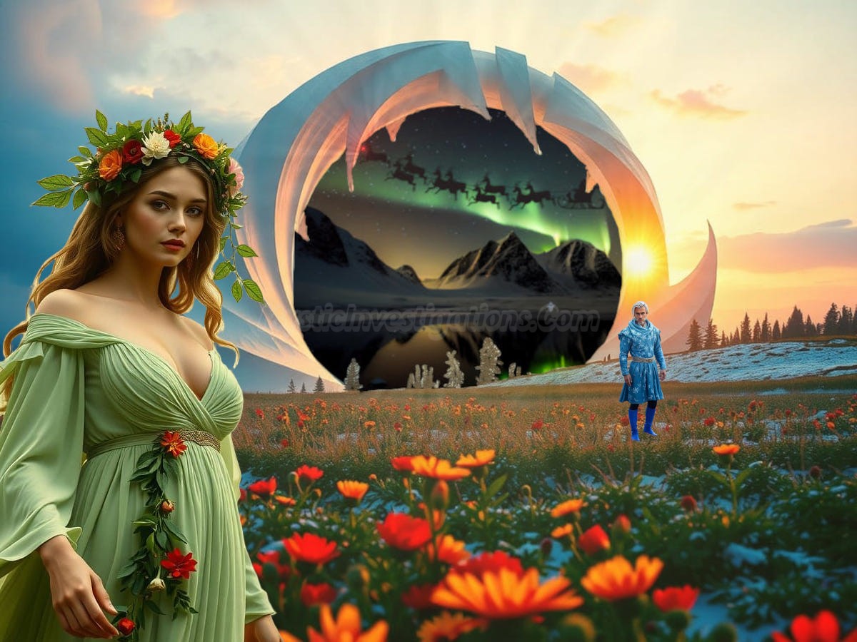 A paranormal portal to North Pole City featuring Spring Goddess Ostara and Winter God Jack Frost.
