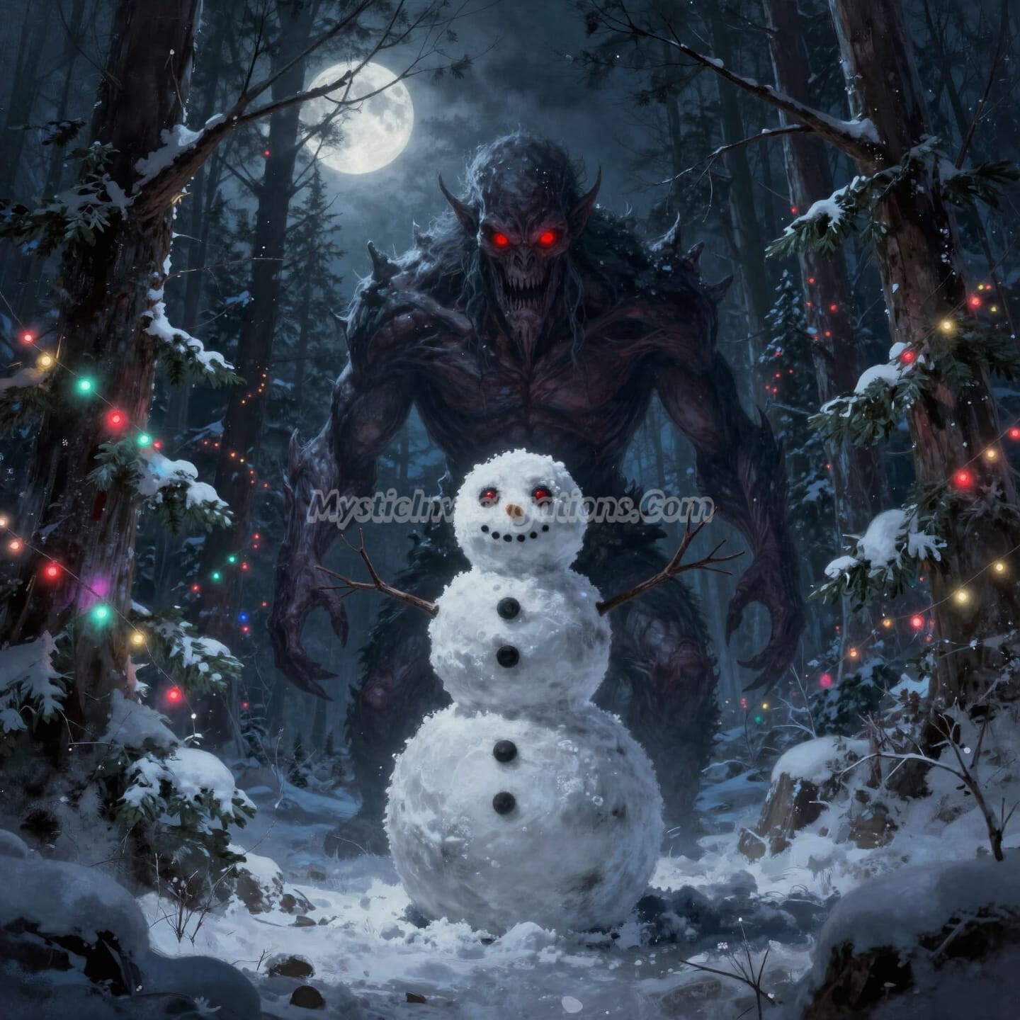 When the hat touched the snowman’s head, something stirred, but it was not the boy. The air grew still, the wind died, and the snowman opened hollow eyes that reflected no innocence. What rose from the snow was Anti-Frosty, an ancient entity that had slumbered beneath the ice long before the village ever stood. It now possessed the form of a snowman. The father’s desperate act had not saved his son. It had opened a door to a force of evil previously banished by righteous warriors older than history itself!