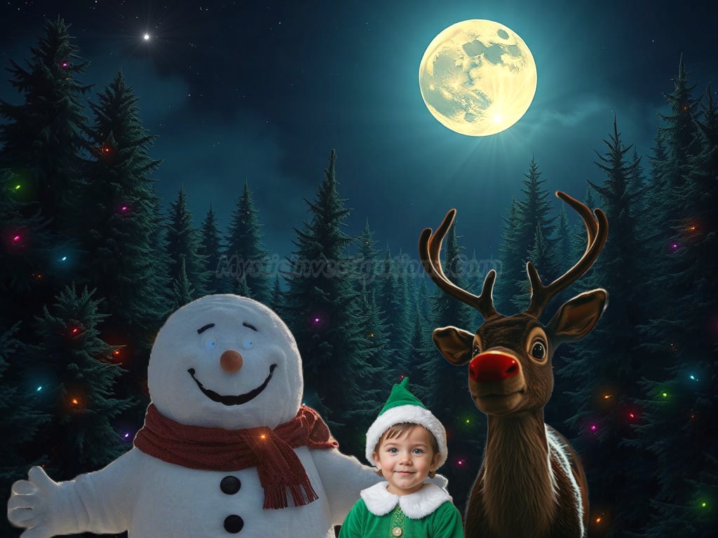 Frosty, Rudolph, and Ernie The Elf in Claus Forest at North Pole City.