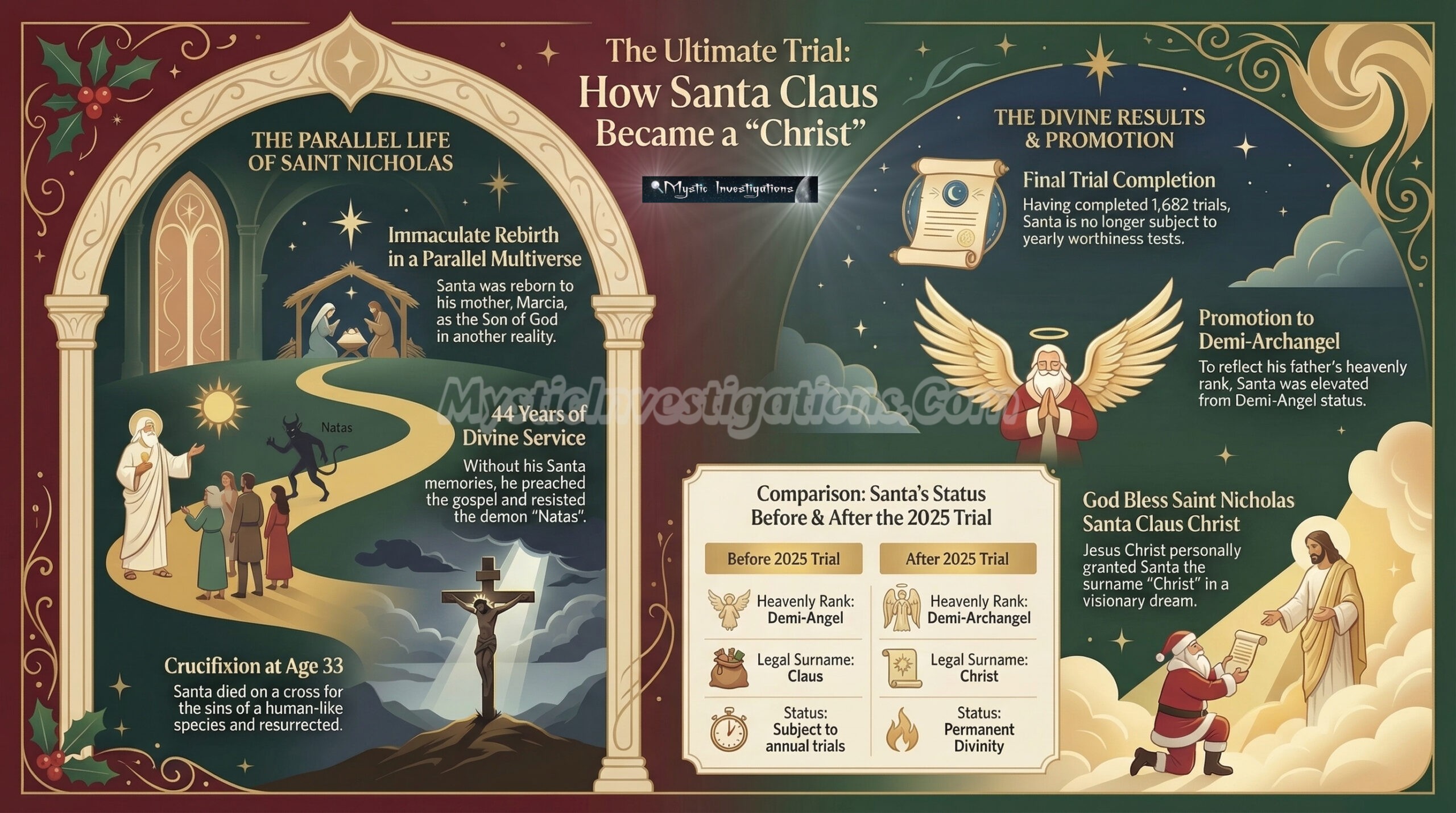 Needless to say, he seriously missed his Wife Holly, his two kids Nick and Mary along with everyone at North Pole City! Finally, on Candlemas 2026 his Father and two other Archangels visited Santa in person to inform him of the good news. He was now not only a permanent Demi-Angel but a Demi-Archangel to reflect his Fathers Heavenly rank. After 1,682 Saint Nicholas Trials this was the final one! I mean what else could they do after this? He was literally Jesus Christ and he suffered a crucifixion! How do you top such a holy sacrifice? That night as he slept Jesus Christ visited him in his dreams and spoke about their common experiences. He accepted Santa as a brother and granted him the surname name Christ. The conversation seemed to last for decades but Santa still woke up 8 hours later! God bless Saint Nicholas Santa Claus Christ! Amen!🎅