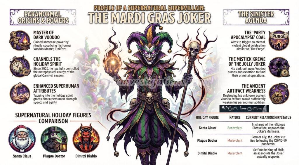 The Mardi Gras Joker is the jester-looking Voodoo Master leader of dark Mardi Gras and Carnival at large. He is virtually the only entity of evil to gain command of a mainstream holiday! The Joker has control of the Spirit Of Mardi Gras and feeds off its metaphysical energy of moral corruption, excessive partying, and all manner of diabolical debauchery! In addition, his ominous organization stokes the flames of this Spirit with their malevolent machinations. His...