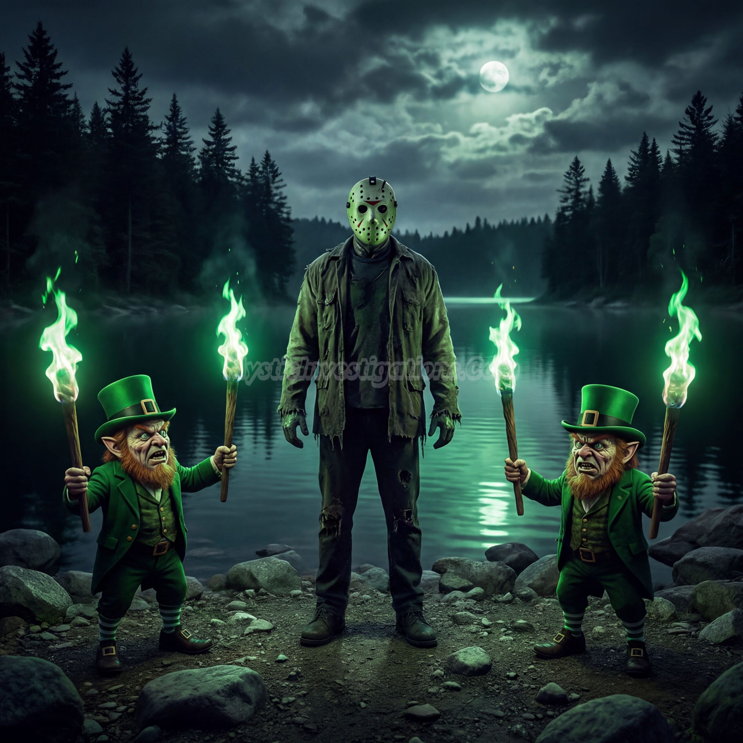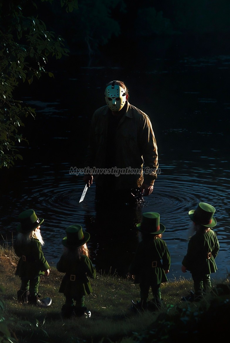 The motley torch wielding crew gathered near a lake in Louisiana just before the 3:00 AM The Devil’s Hour. The crazed cultists re-christened the body of water to Crystal Lake to throw off supernatural hunters. Jason stared confused for a bit as he witnessed two 3-foot tall Clurichauns bow before him while holding torches of green magical flames. a third one handed Jason a brand-new machete forged from mystical Underworld metals coated in dark Leprechaun gold. While in his presence they absorbed the bad luck that permeates the very tissues of the Voorhees menace.