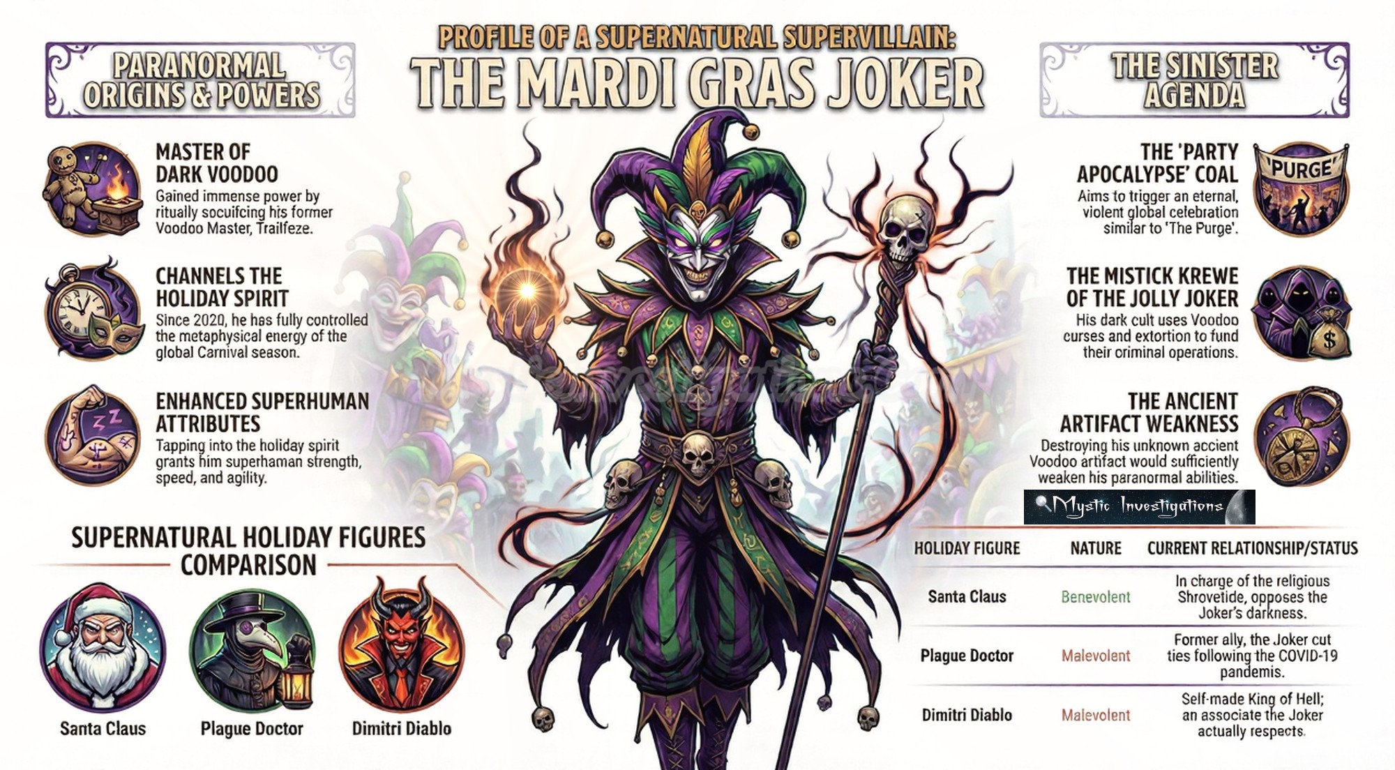 The Mardi Gras Joker taps into the metaphysical energies of chaotic debauchery resulting from excessive partying. The release of moral values seen in various Carnival celebrations in New Orleans, Rio de Janeiro, and other places around the world are the main fuel for his frightening flames of terror. Although his central base of nefarious operations is in New Orleans, Louisiana. Gaining leadership of a holiday requires a great deal of power and magic to take over the Spirit of any given season.