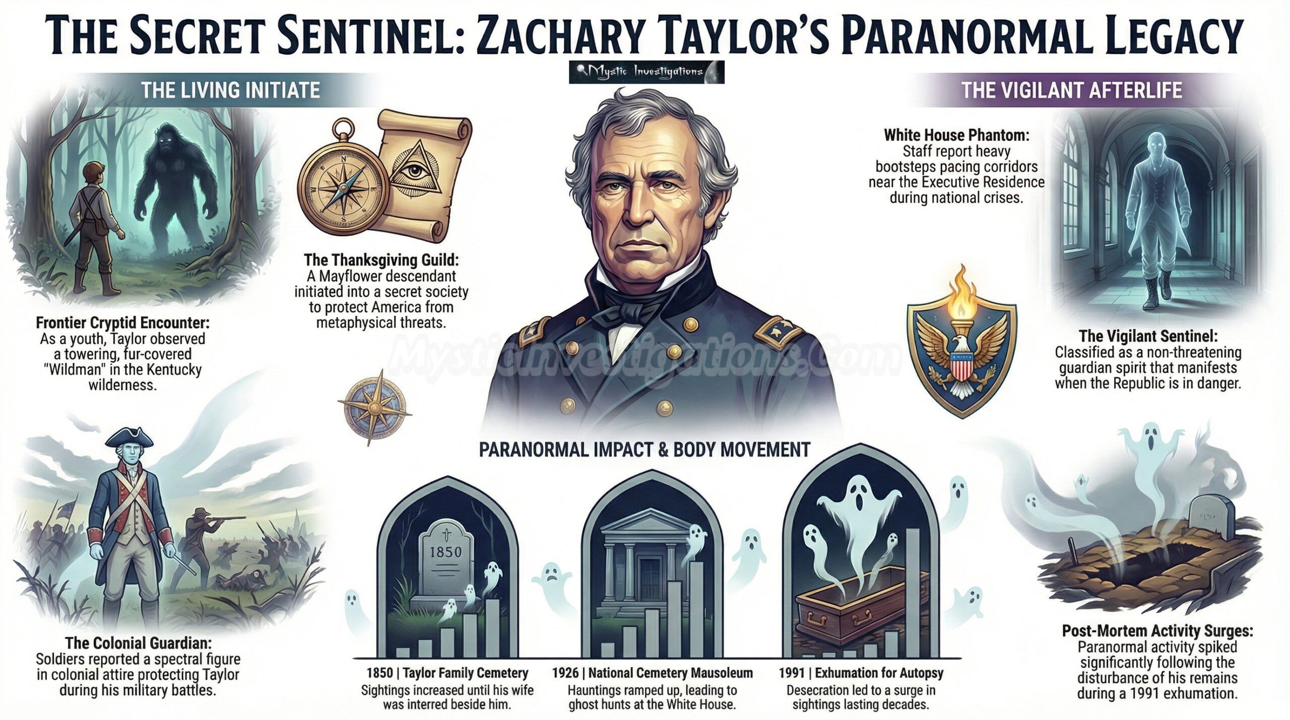 History remembers Zachary Taylor as a Soldier-President whose time in office was tragically brief. But in the deeper currents of paranormal tradition, he stands as something more enduring. A frontier witness to cryptids, a secret initiate of ancestral guardians, and a spectral protector who may still walk the quiet hills of Kentucky when the Republic trembles.๐บ๐ธ