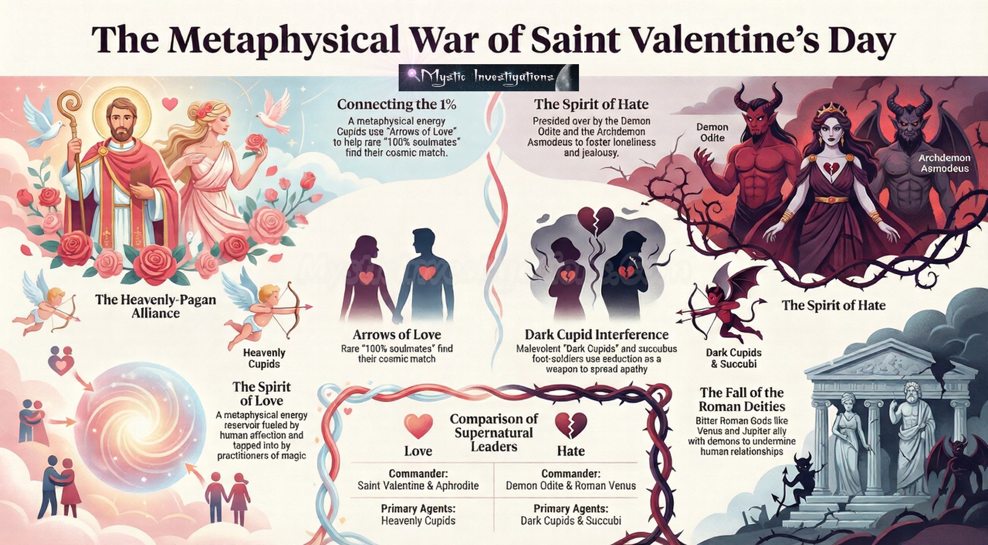 manifest it around the world. Saint Valentines Day is the pinnacle of their paranormal quest to imbue love and harmony upon humankind. In some cases, it’s especially needed due to Dark Cupids, aka low-level demons who specialize in growing hatred in the hearts of humans. Sometimes they may merely weave the web of apathy to suffocate the flames of passion. While Cupids look to bring couples, friends, and family together, Anti-Cupids relish breaking up relationships of all sorts! That is why Valentine’s Day is also Anti-Valentine’s Day as both of these forces clash on February 14th.